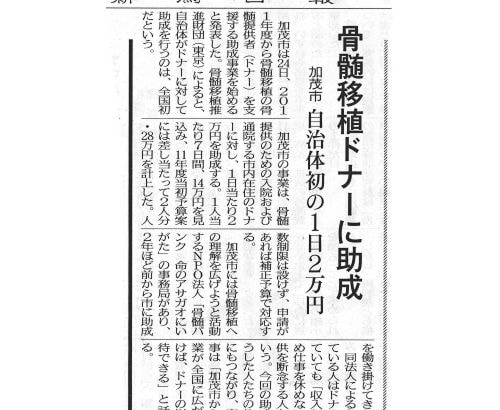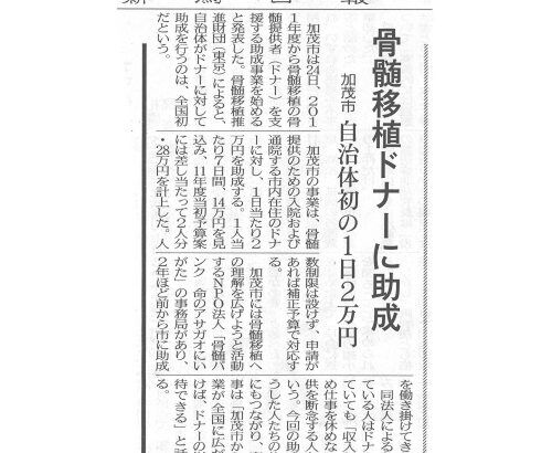 加茂市は24日、2011年度から骨髄移植の骨髄提供者(ドナー)を